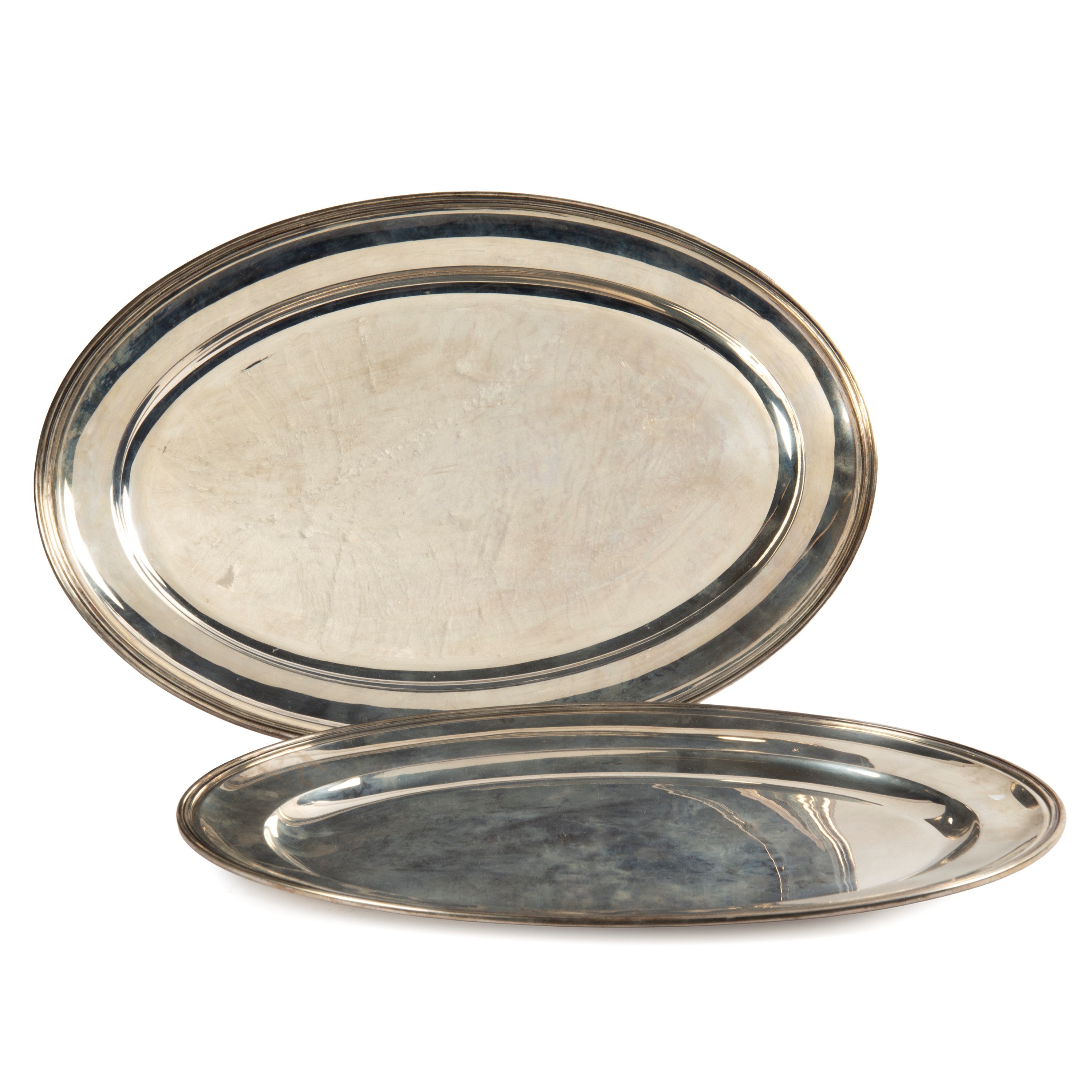 in argento, di forma ovale, bordo scanalato, cm 49X33 e cm 46X31, complessivi g 2460
