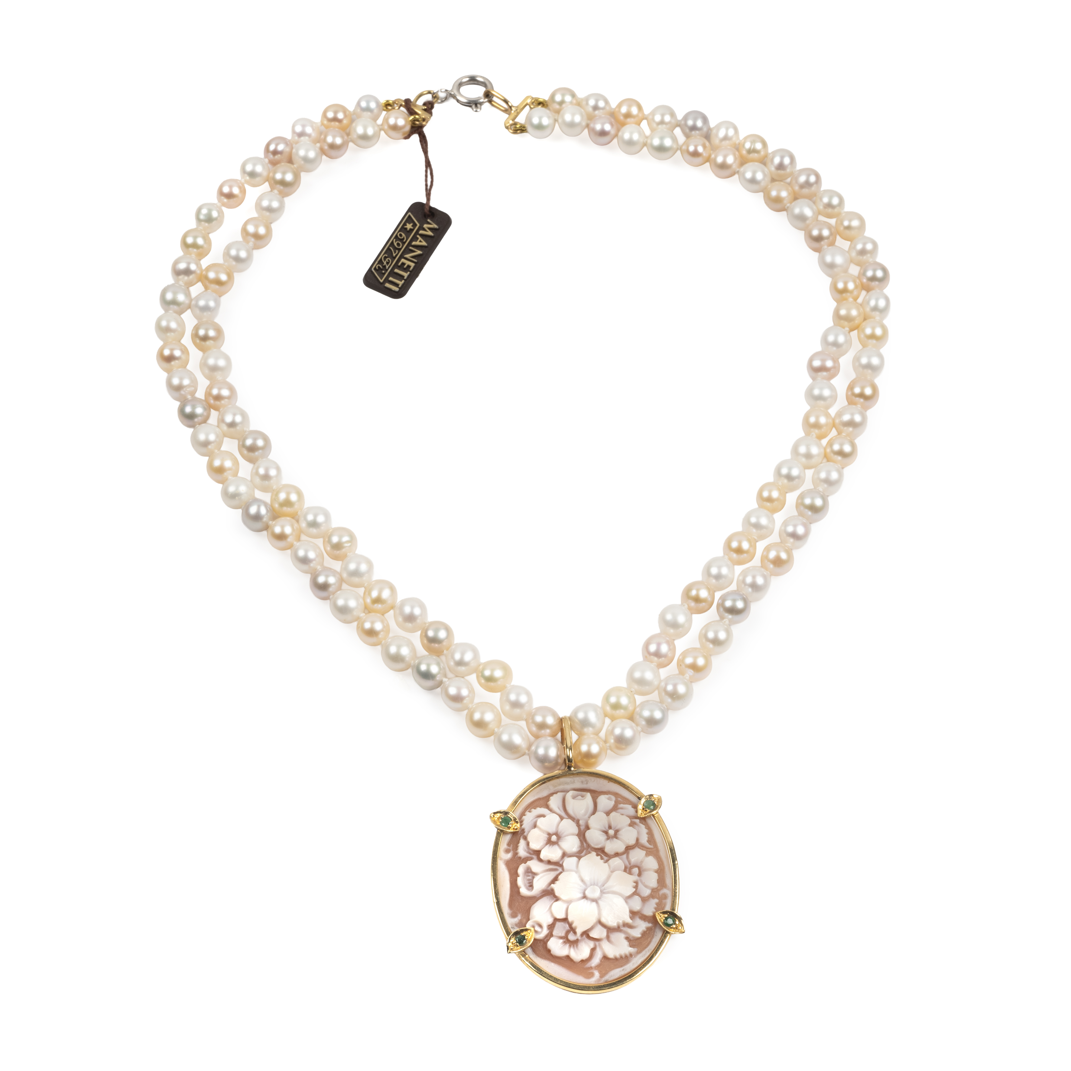 realizzato a due fili di perle mm 6/7, pendente a cammeo montato in oro di forma ovale raffigurante fiori, cm 5X4, lungh. cm 46