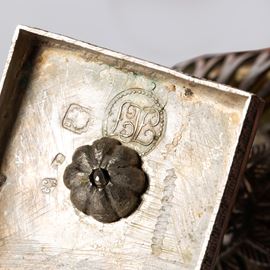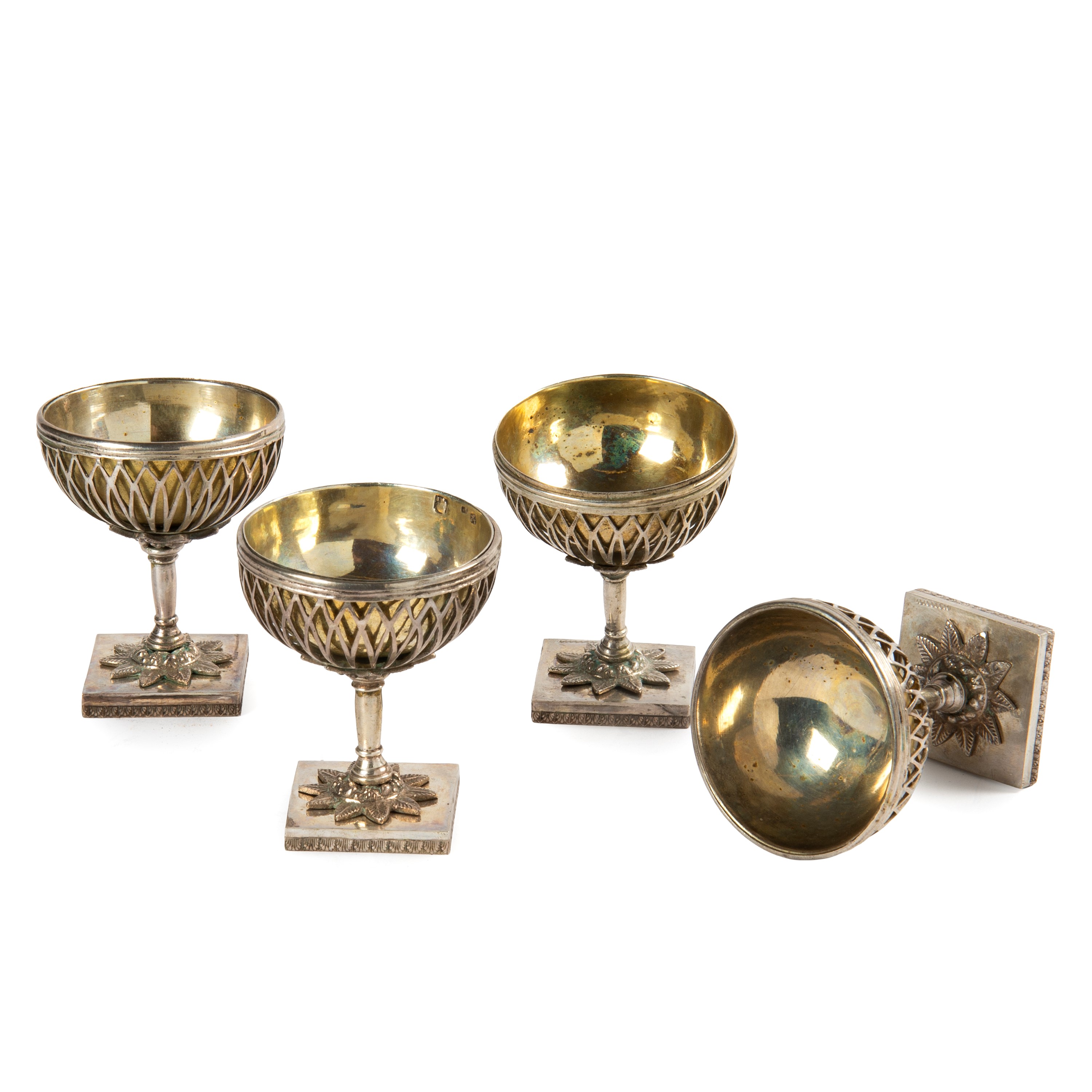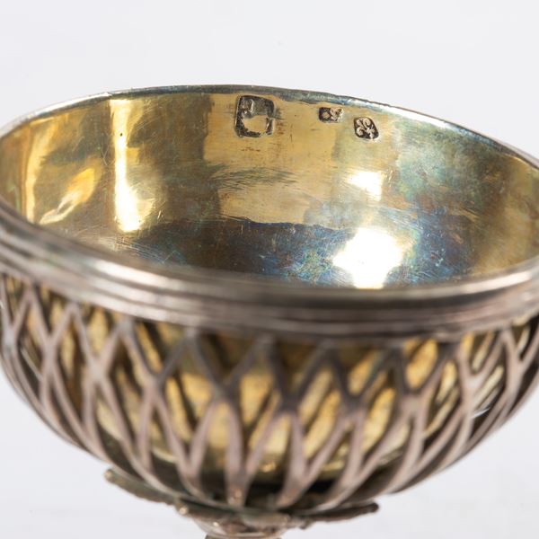 in argento, fusto a colonna, coppette portasale entro montatura a cestino, base quadrata, alt. cm 8 diam. cm 6,5 complessivi g 450