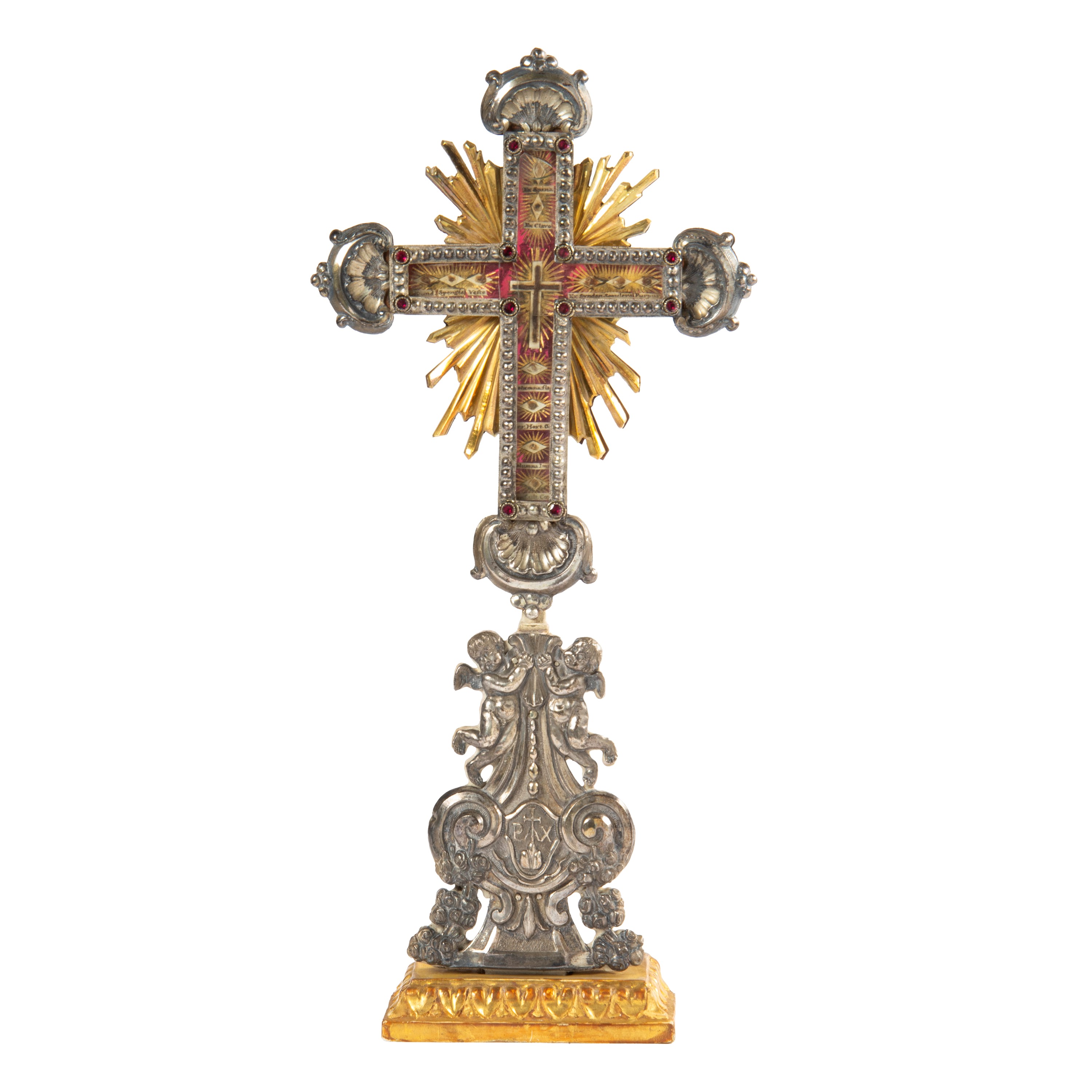 in argento, metallo e legno dorato, a forma di croce sorretto da putti alati, base in legno, cm 36X16