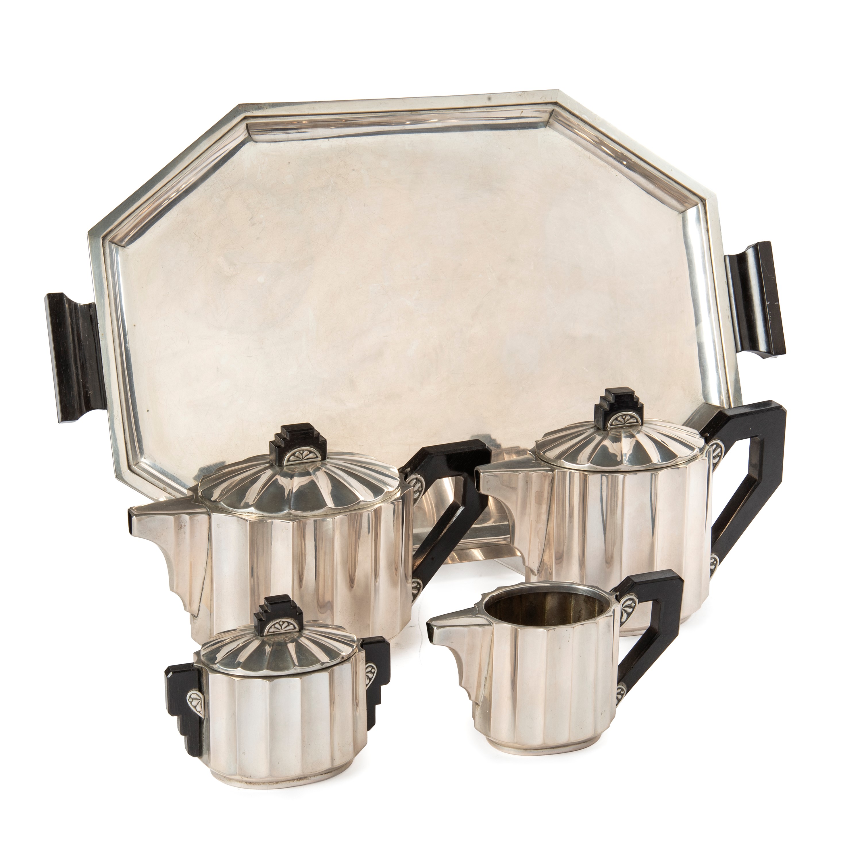 in argento, corpo scanalato, composto da teiera, caffettiera, lattiera, zuccheriera e vassoio sagomato,