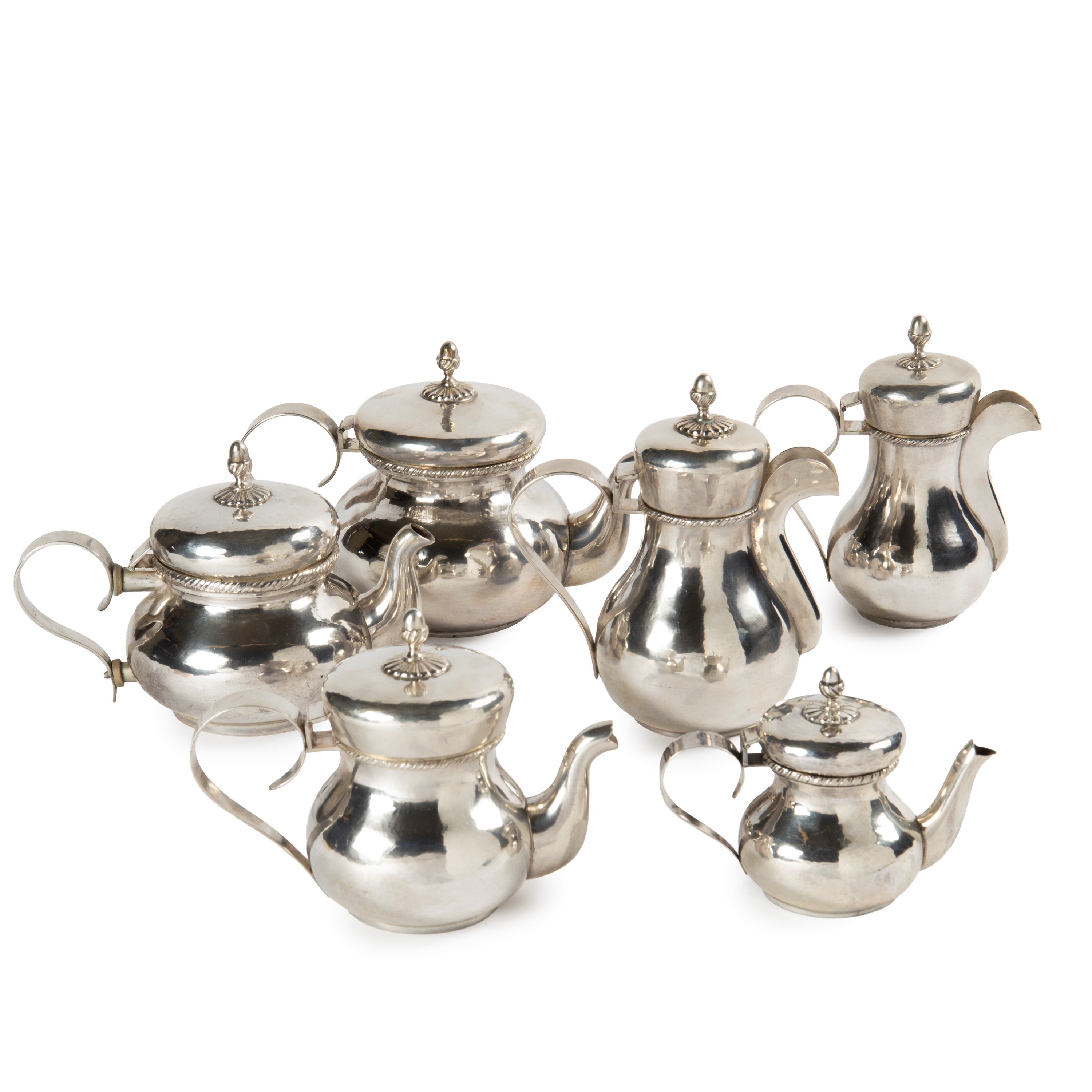 in argento 800, composto da due teiere,due caffettiere,zuccheriera e lattiera, manici a voluta, complessivi g 3100 una caffettiera con ammaccature
