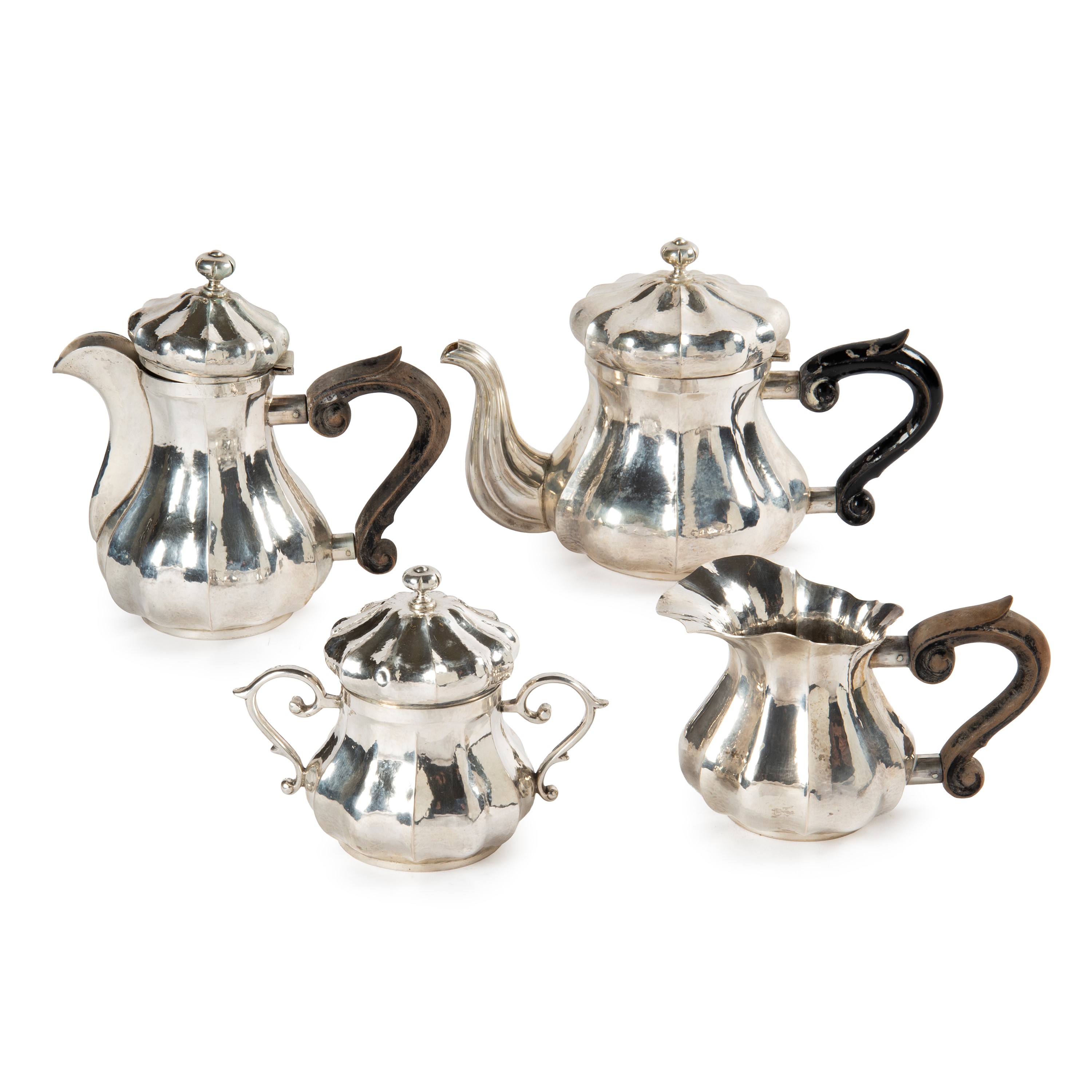 in argento, composto di quattro pezzi, corpo bombato, manici in legno, complessivi g 1990