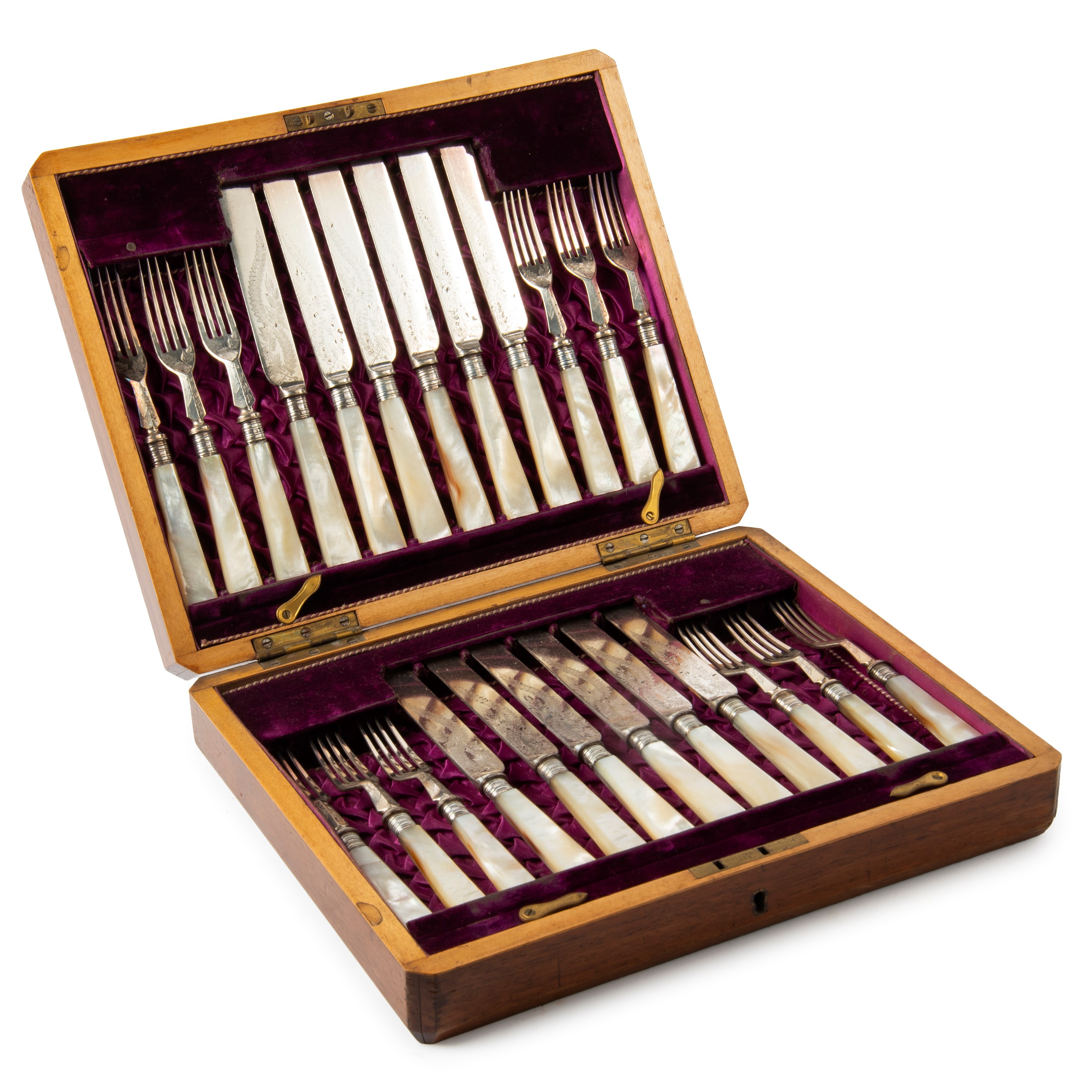 in metallo argentato composto da dodici coltelli e dodici forchette con manici in madreperla, entro scatola in legno