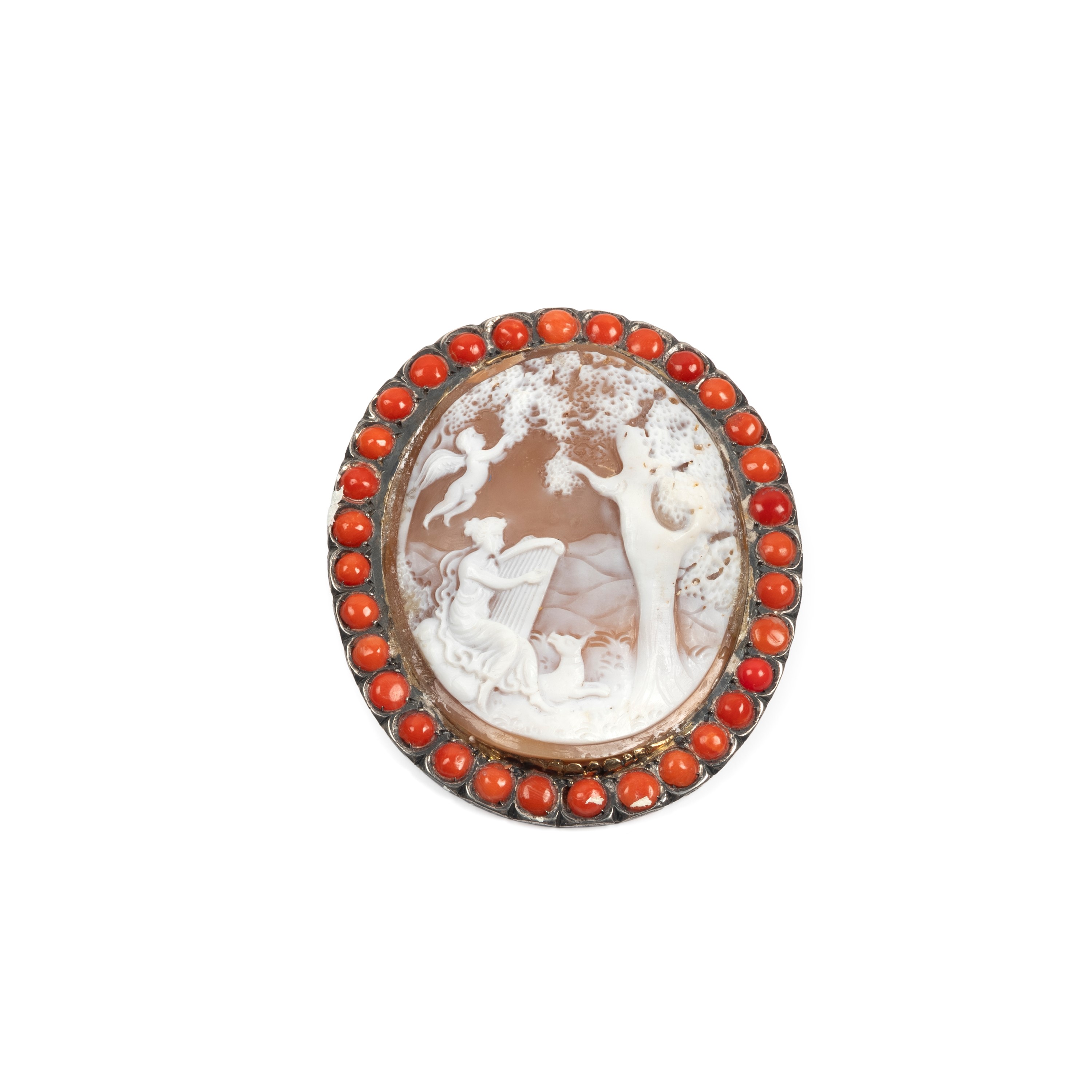 di forma ovale, con cornice decorata con coralli cabochon, misura cammeo cm 6,3X5