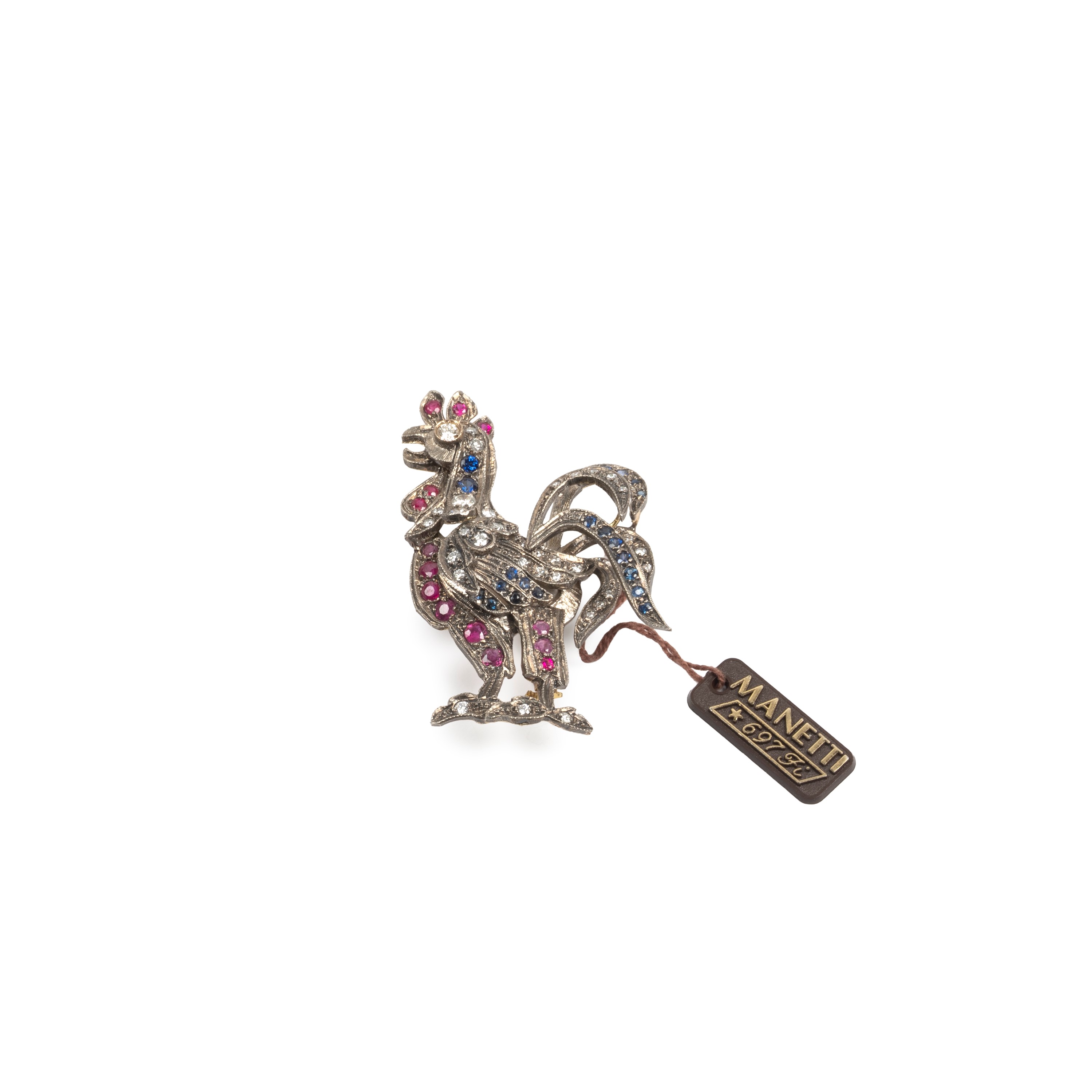 a forma di gallo, impreziosito da diamanti, zaffiri e rubini, g 19, cm 6X4 diamanti di circa ct 0,70