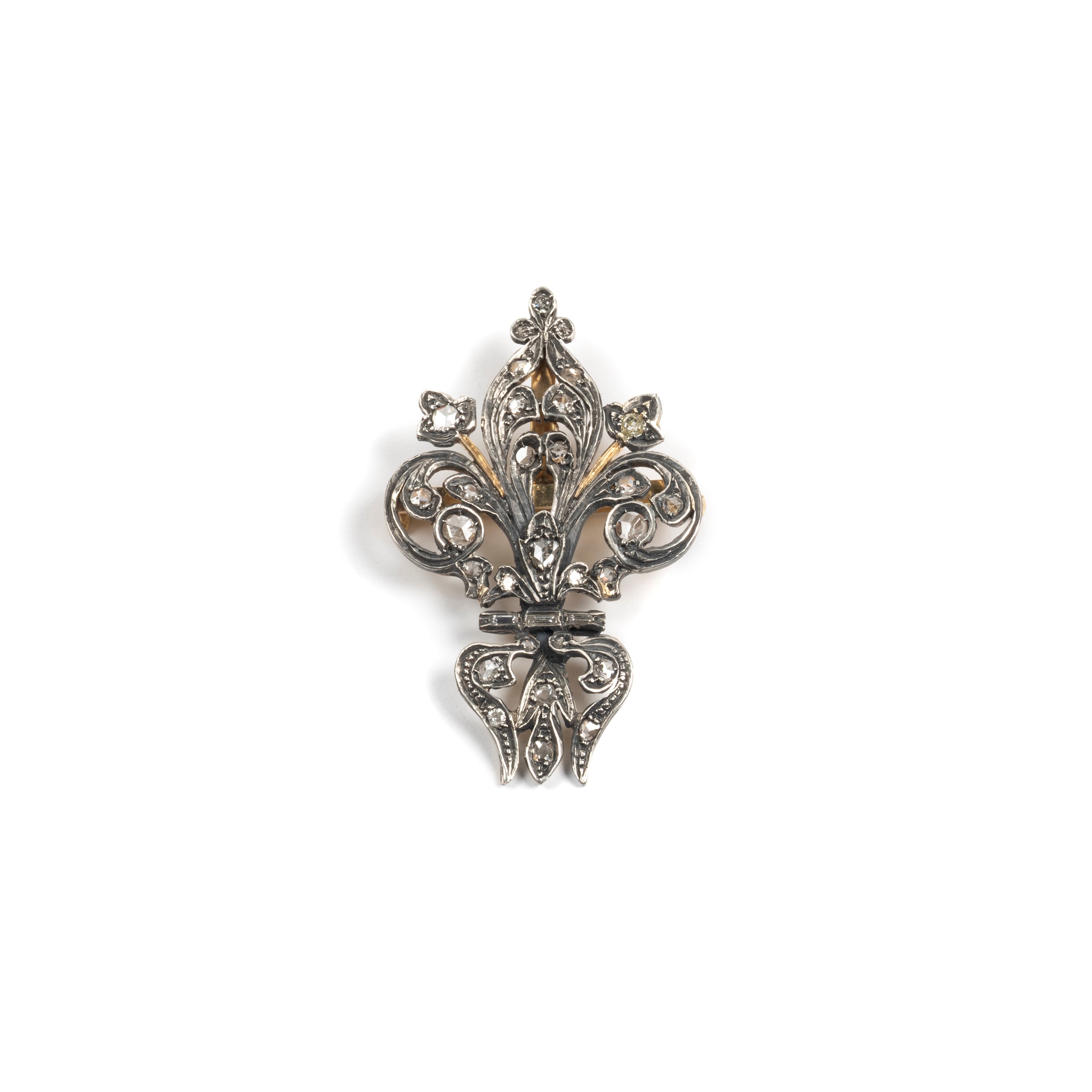 realizzata a forma di giglio, decorato con diamanti, taglio rosa, taglio baguette e taglio antico cm 6,5X4, g 22