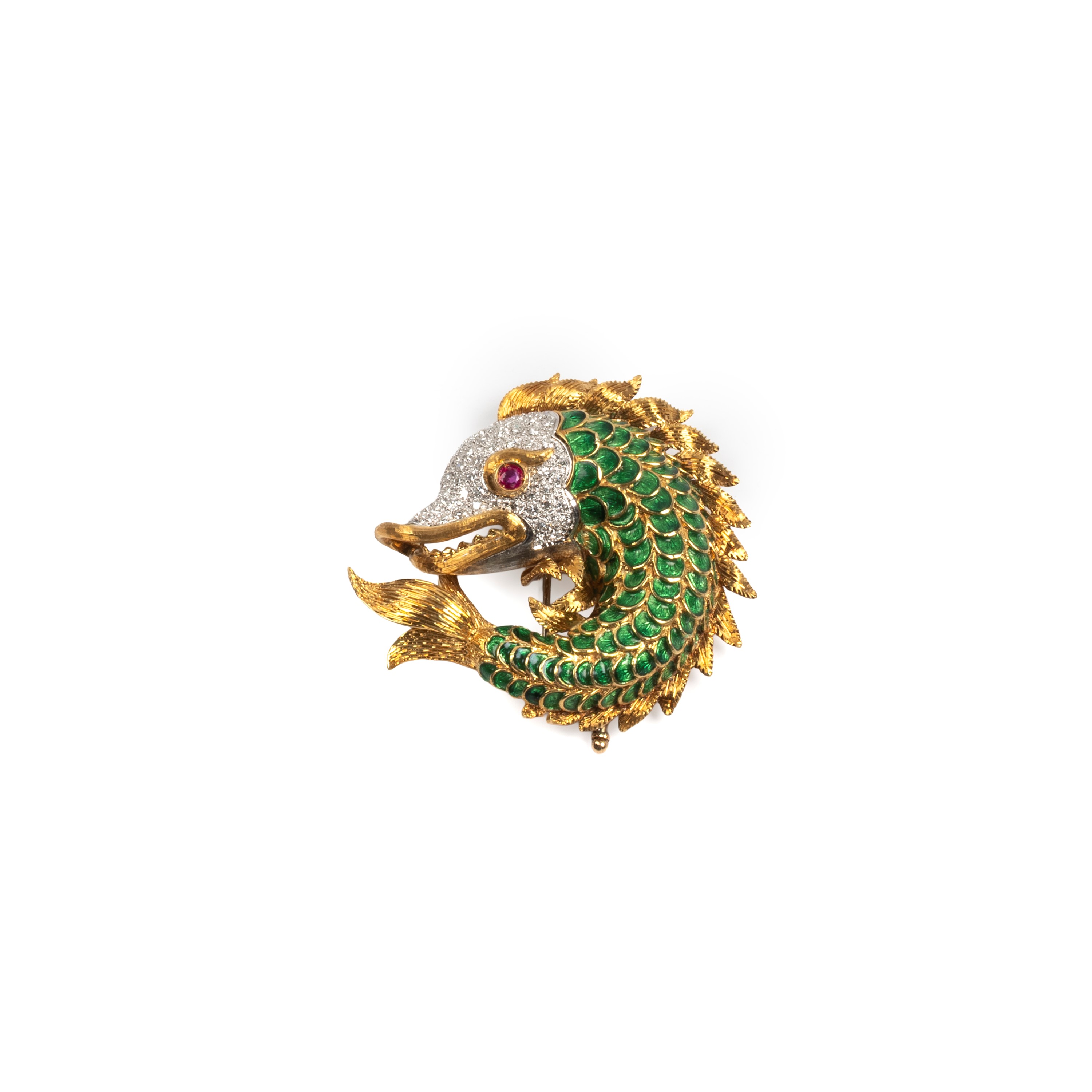 realizzata a delfino, testa decorata a pavè di diamanti, taglio huit-huit cm 6X6, g 42