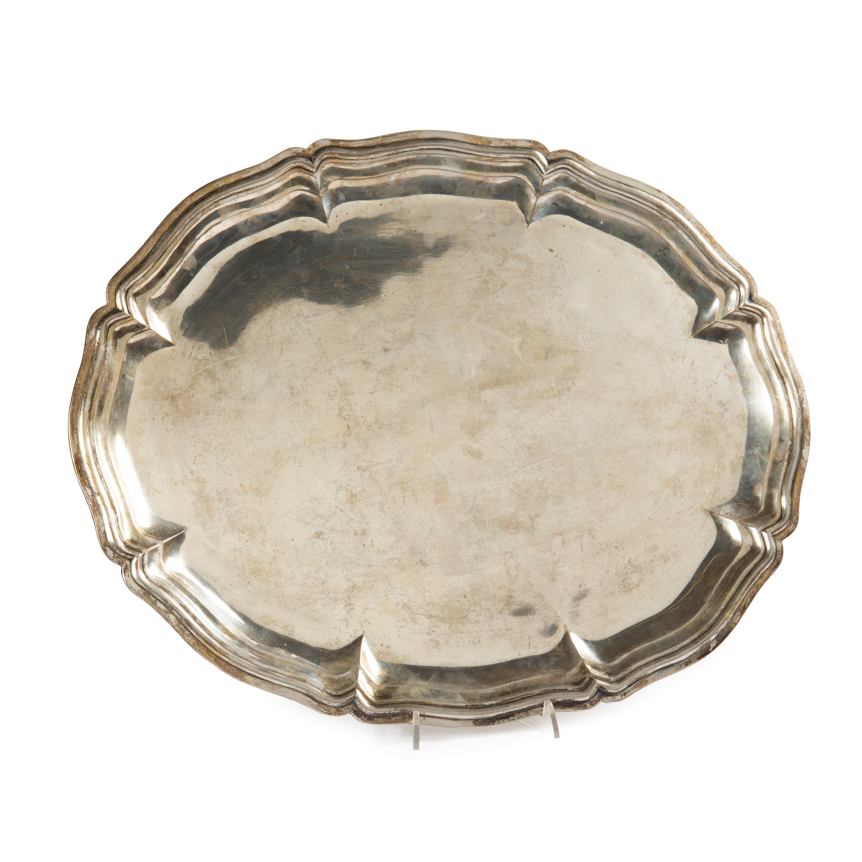 in argento, di forma ovale sagomato, bordo scanalato, cm 56X45, punzone 800, g 1960