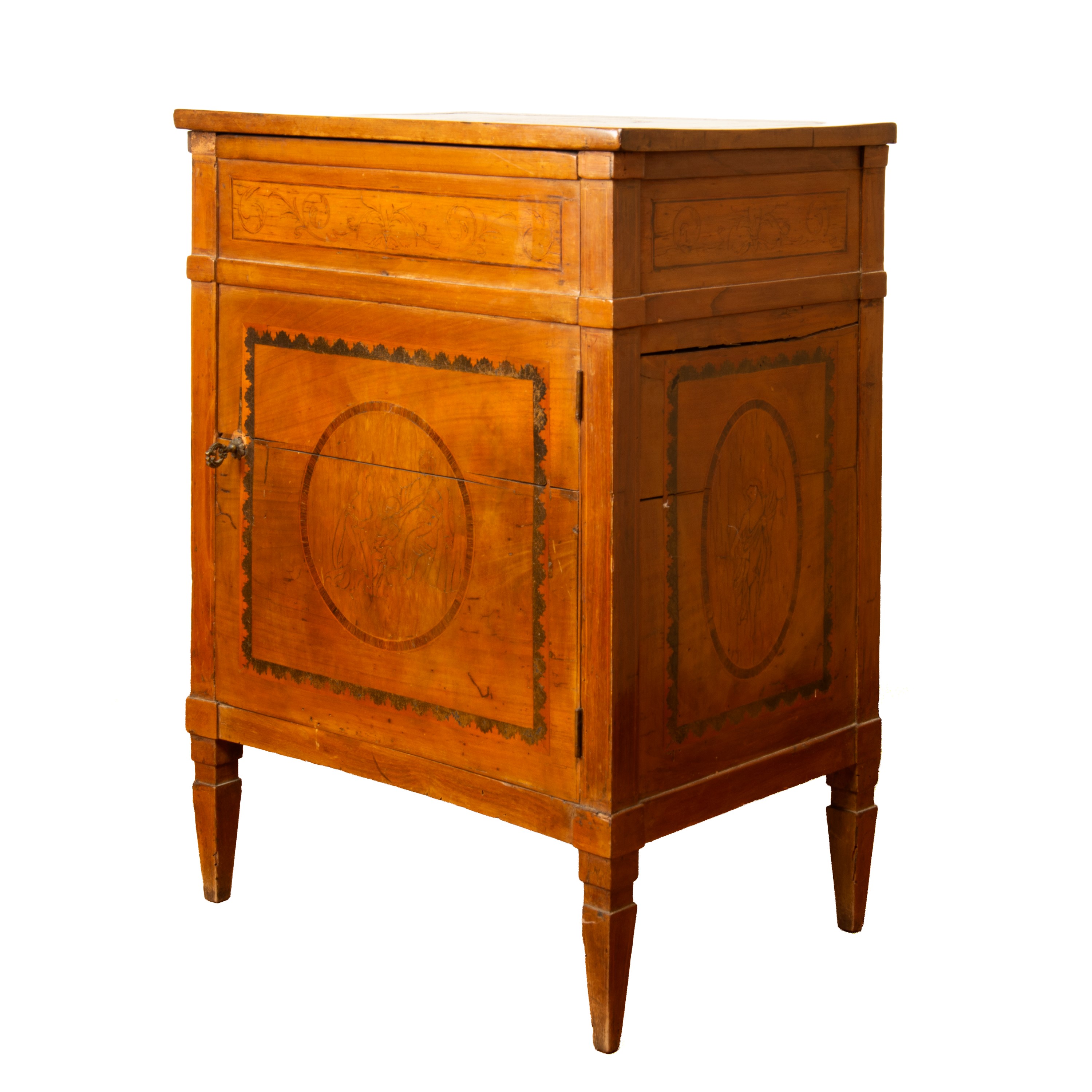 in noce intarsiato, ad uno sportello, gambe troncopiramidali, cm L58xP41xH79