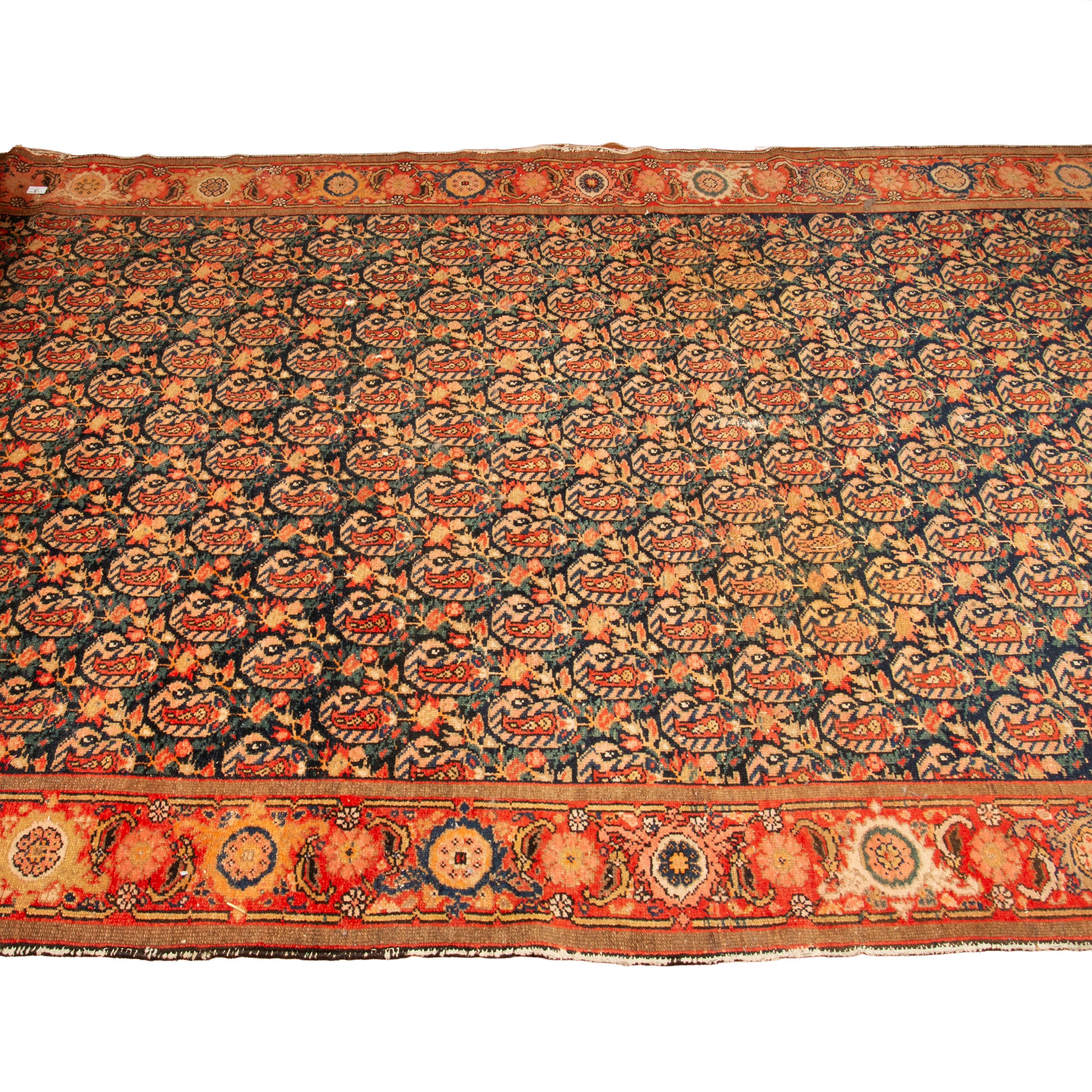 fondo blu con bordura rossa, decorato a motivo di piume, cm 365x173