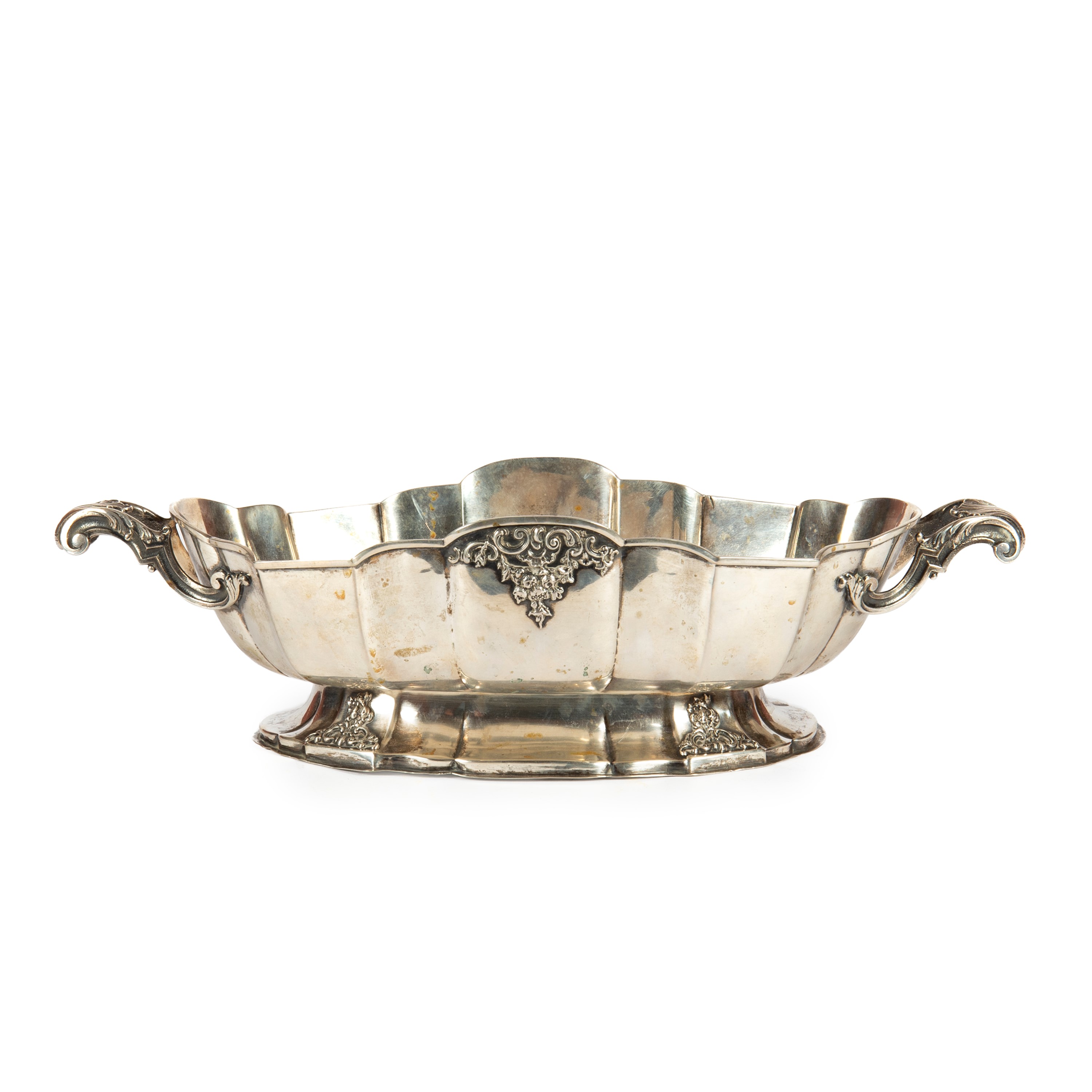 in argento sagomato, con anse cesellate a guisa di conchiglia, cm L44xP20xH10 g 890