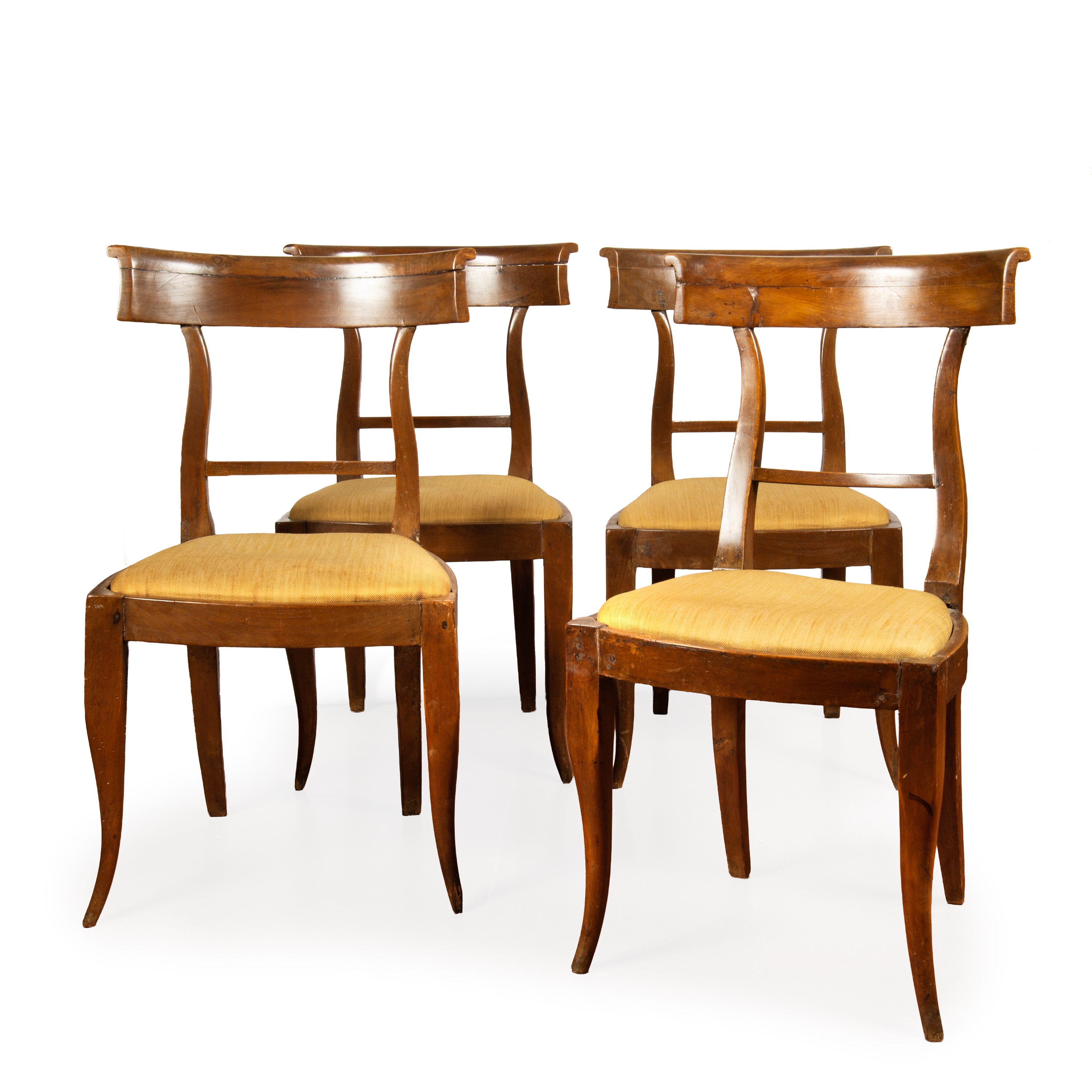 in noce, con spalliera sagomata, gambe a sciabola, seduta imbottite a rivestita in stoffa nei toni del giallo, alt. cm 85 seduta alt. cm 46