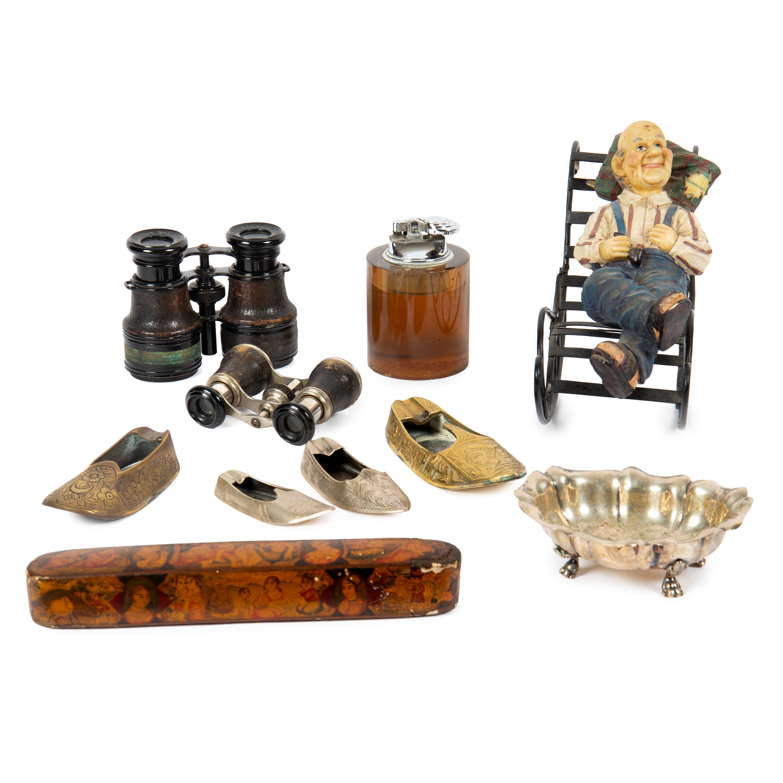 composto da accendini, posaceneri, canocchiali e scatoline in materiali vari