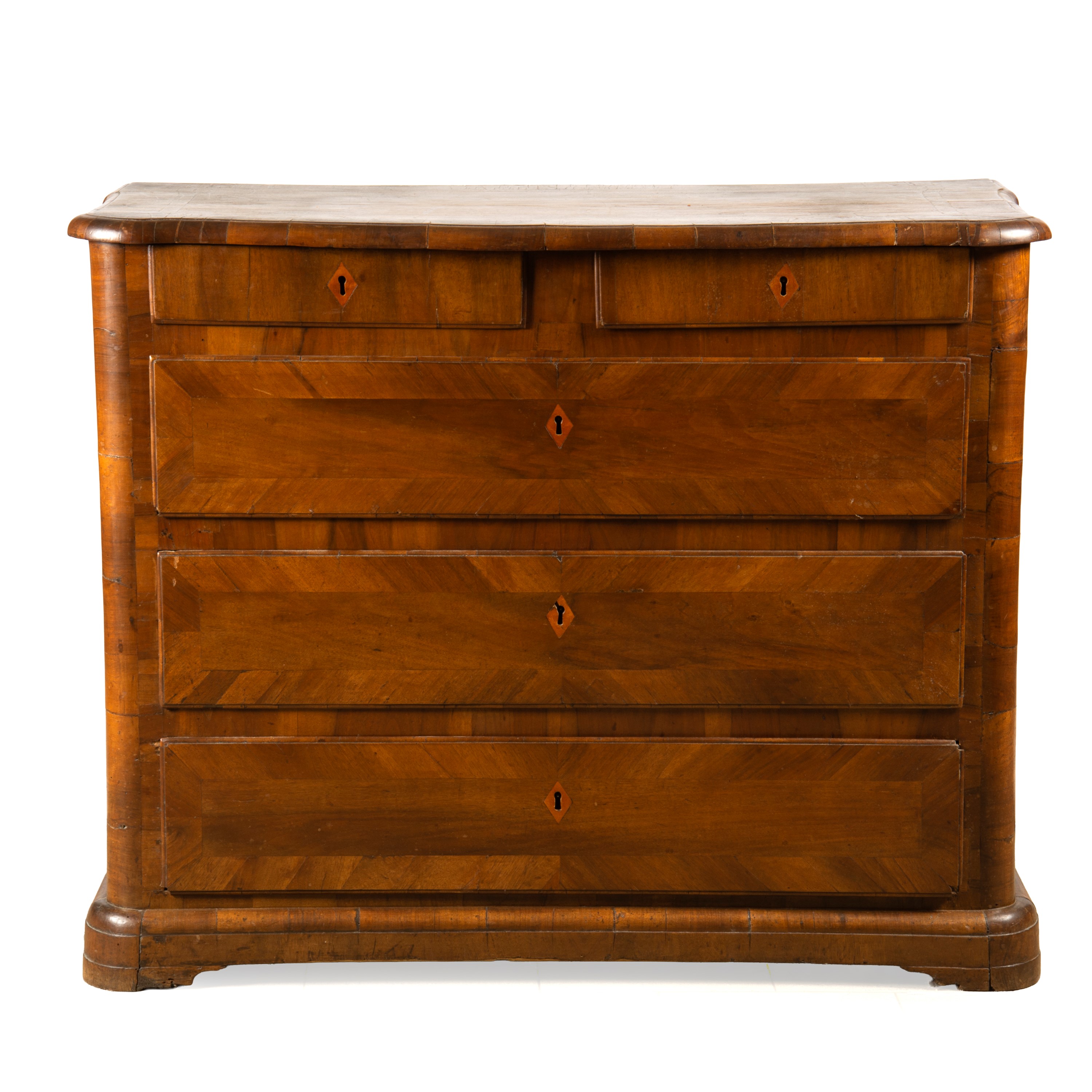 in noce, piano sagomato cinque cassetti, cm L122xP67xH98