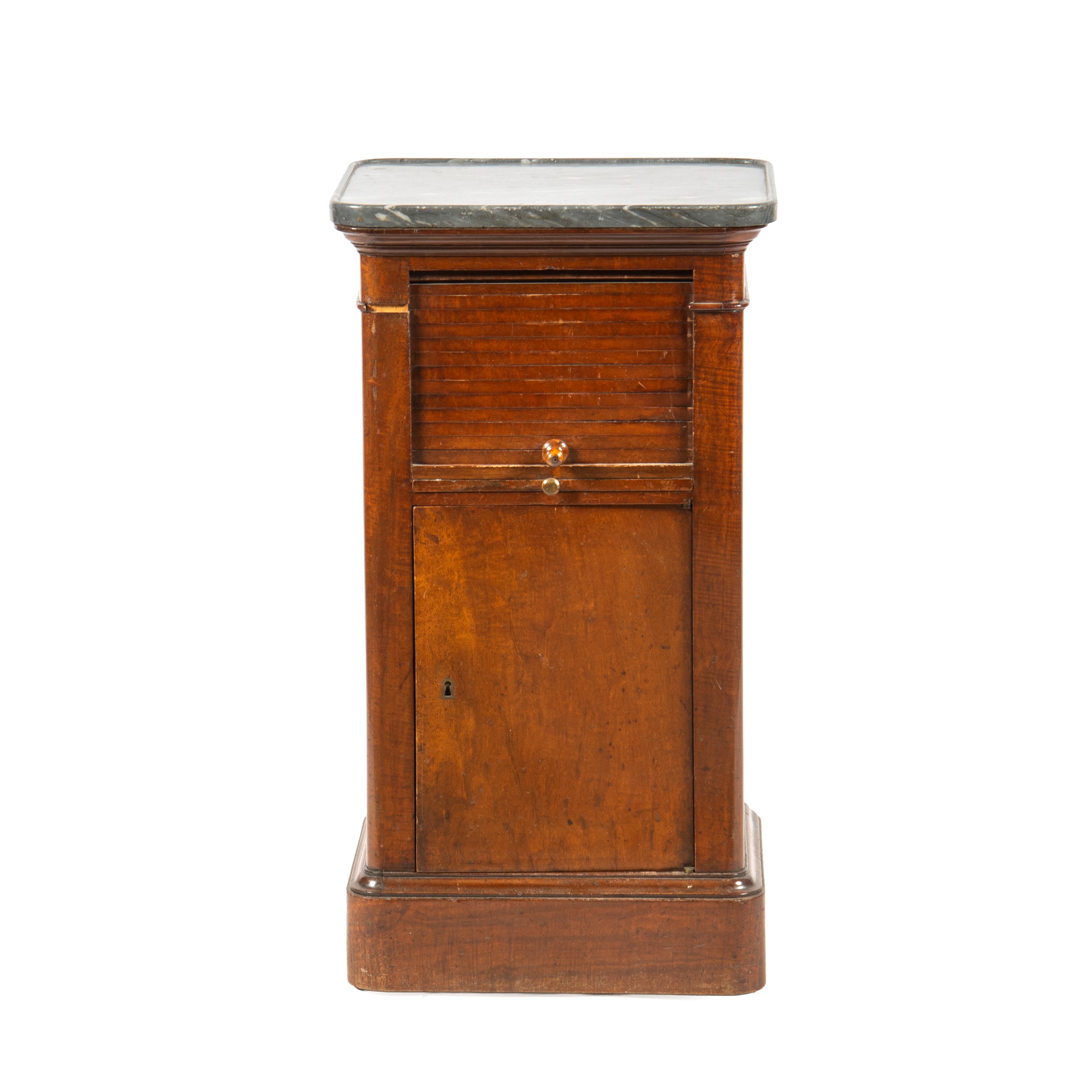 in mogano, a due sportelli uno dei quali a saracinesca, piano in marmo, cm L45xP36xH81