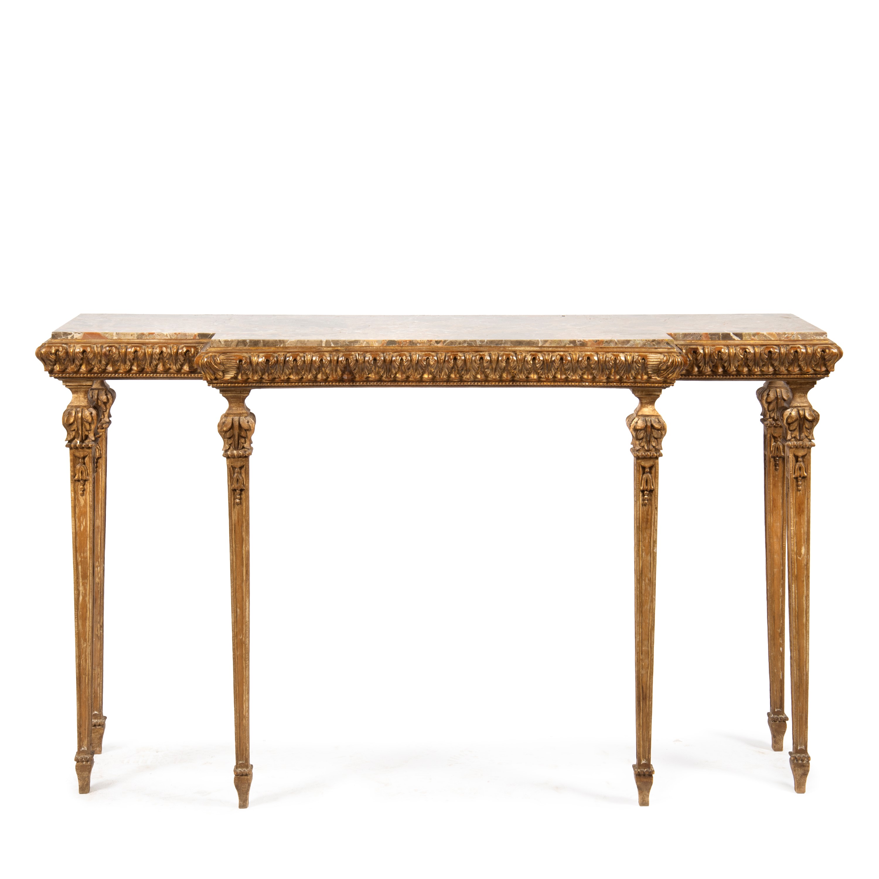 fusto in legno intagliato e laccato, gambe a spillo, piano in marmo, cm L148xP45xH84