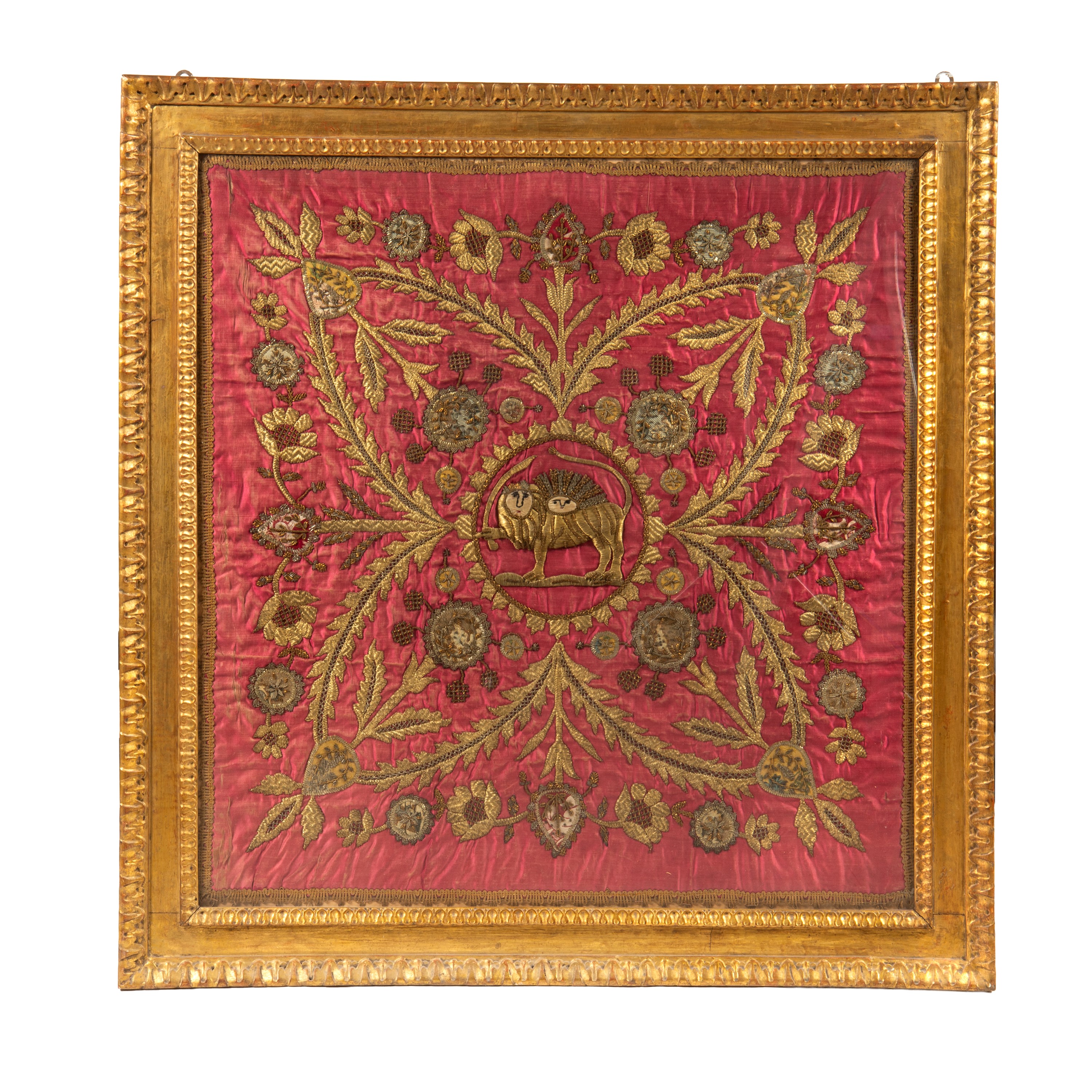 con decoro arabescato a filo oro, montato in cornice dorata, cm 96x92