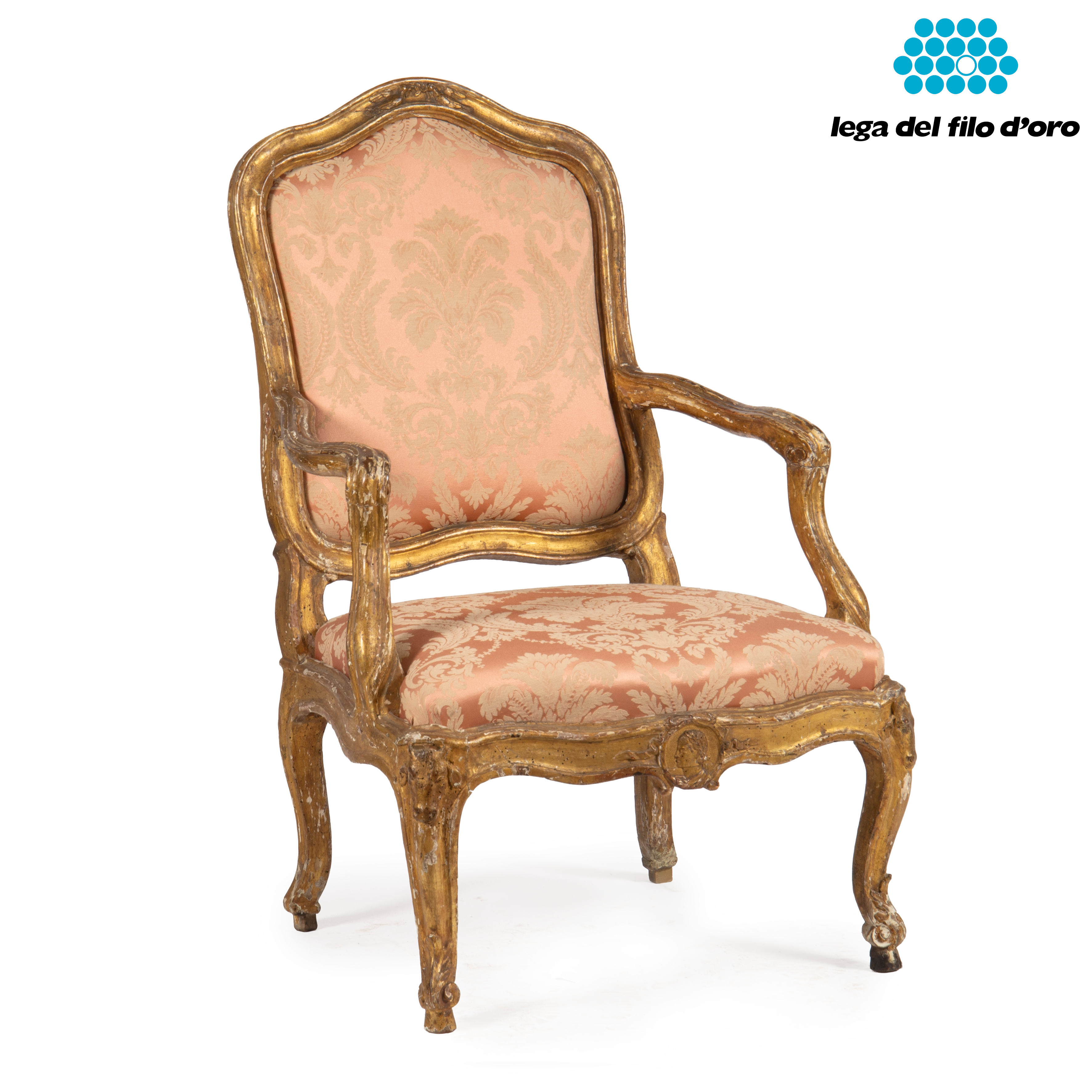 in legno dorato, con braccioli e schienali sagomati, seduta e schienali imbottiti rivestiti in stoffa damascata nei toni del rosa, cm L74xP60xH108