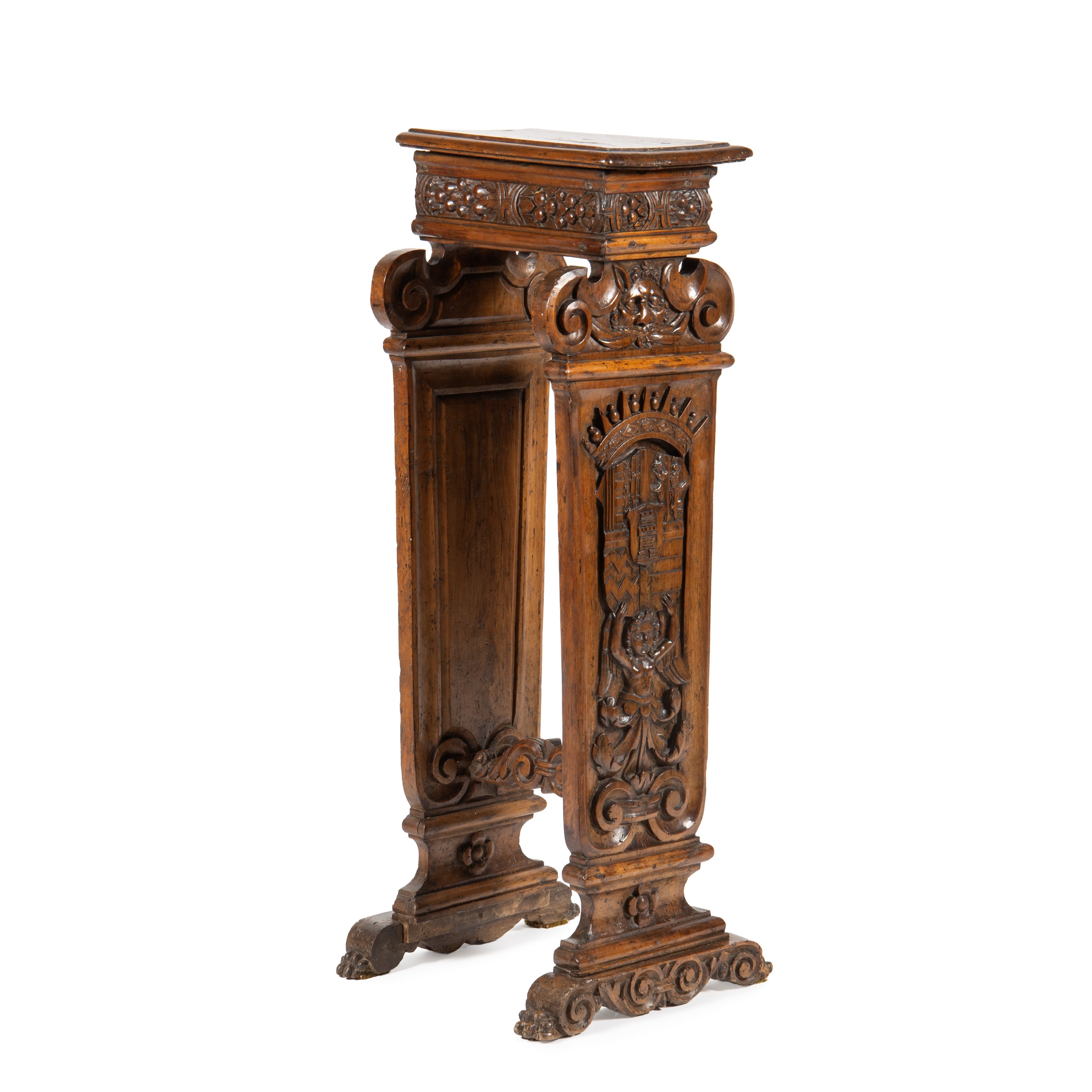 in noce intagliato a stemma nobiliare sostenuto da angelo, cm L29xP40xH110
