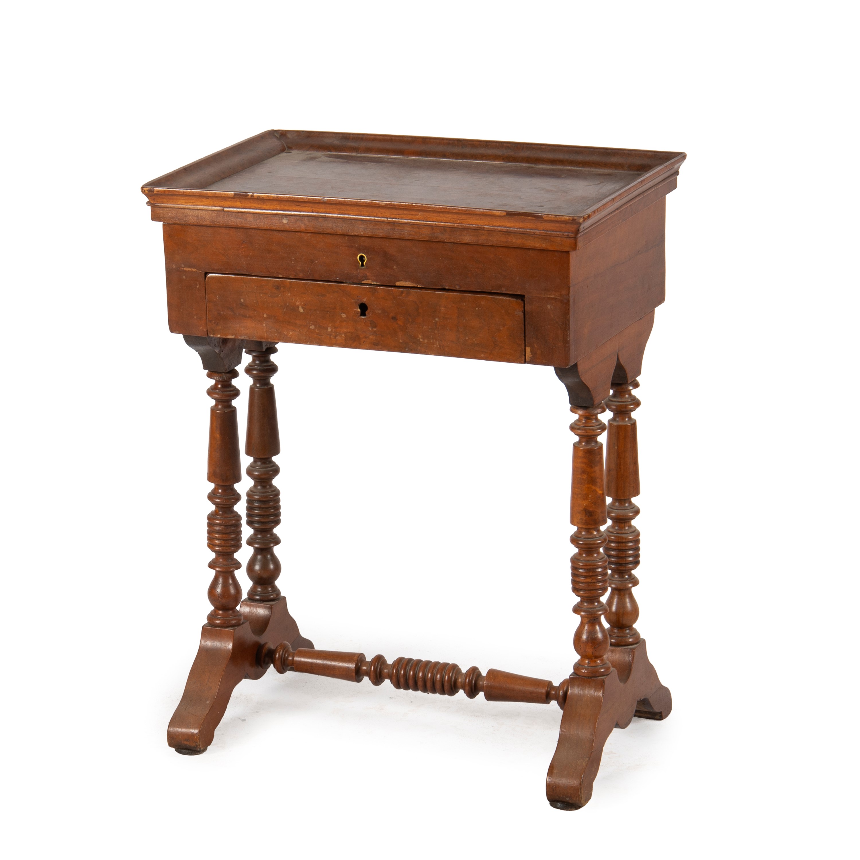 in noce a un cassetto e piano ad alzarsi, sostegni torniti, cm L52xP35xH66,5