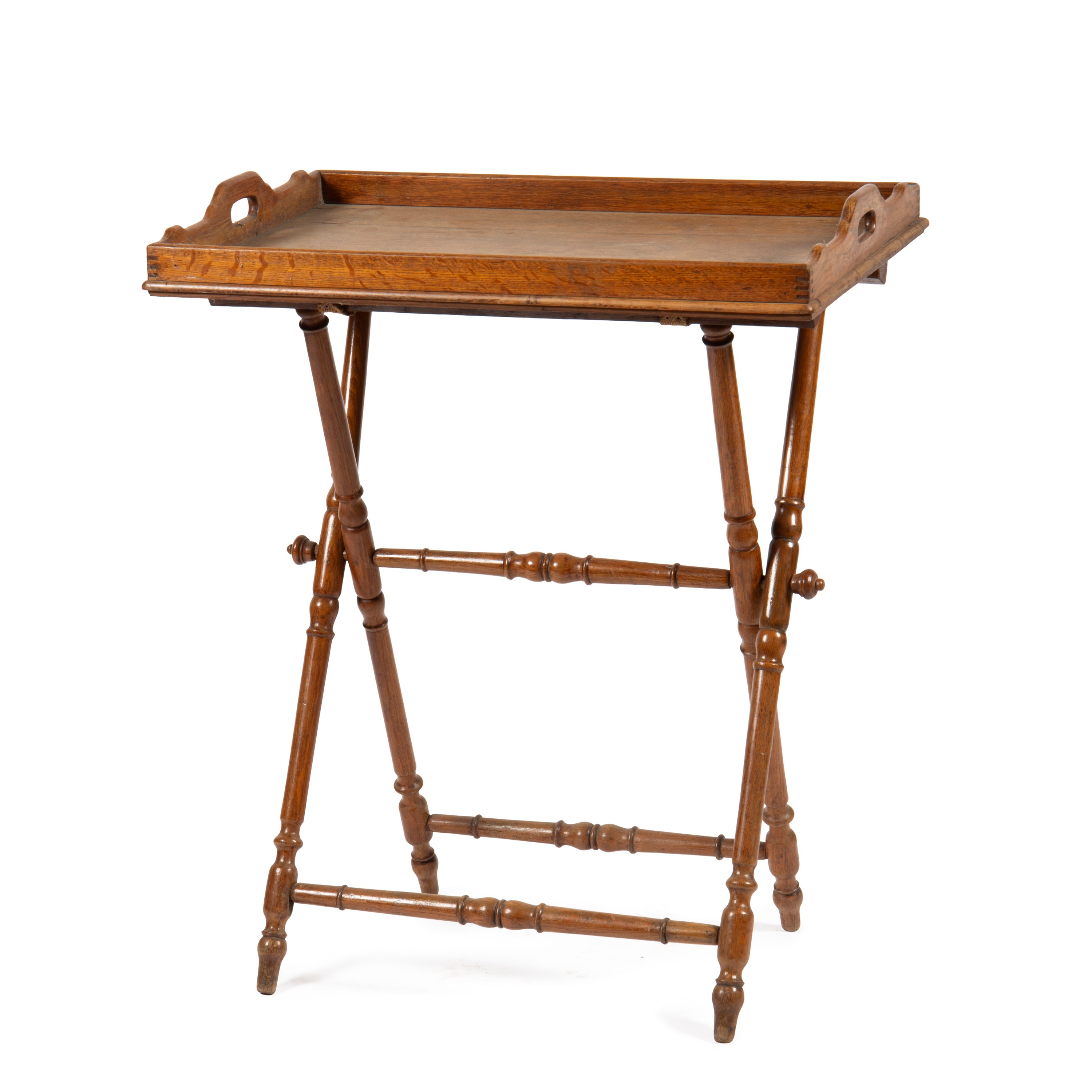 in rovere, sostegni torniti, piano a vassoio, cm L70xP48xH83