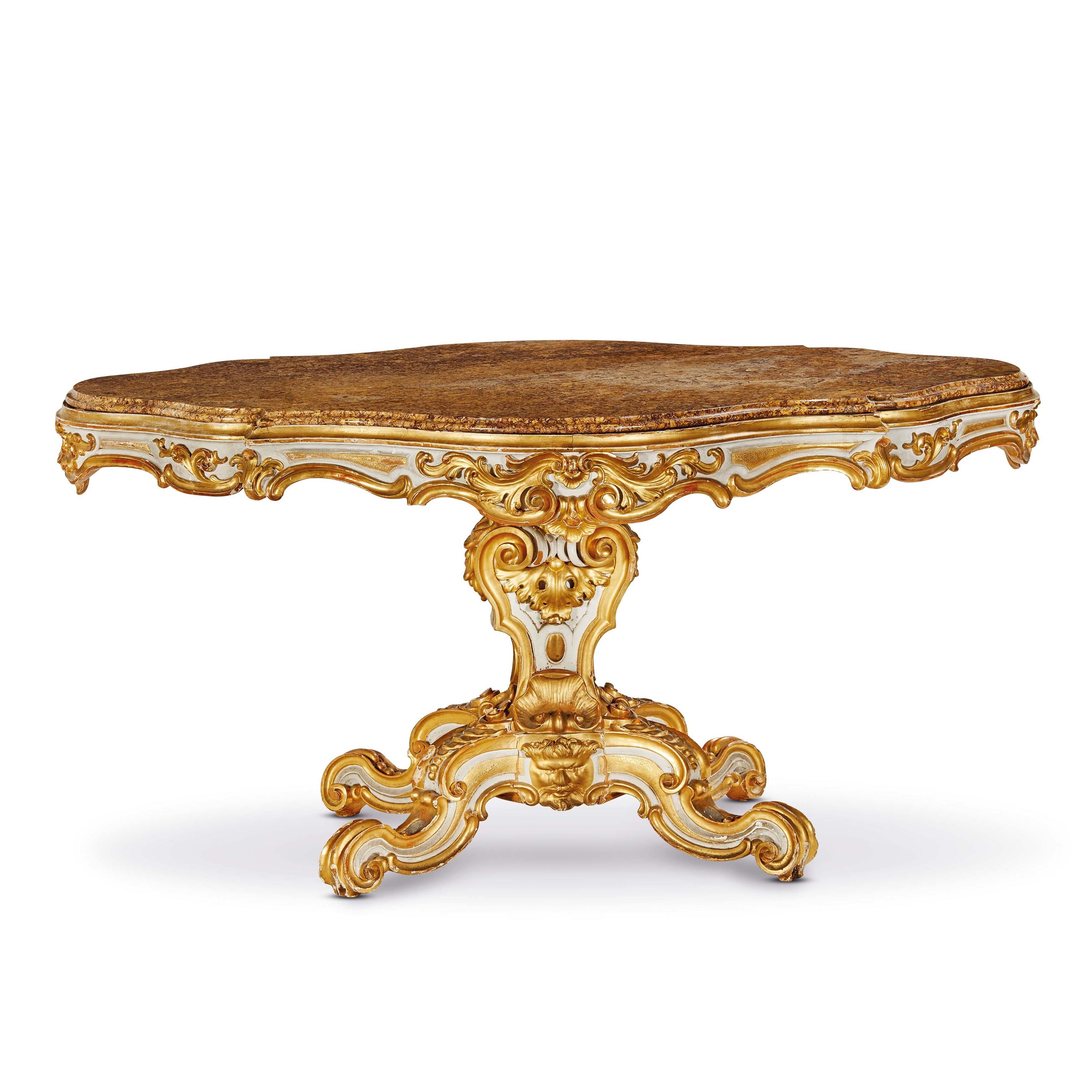 in legno laccato e dorato di forma sagomata con piano incassato in marmo broccatello, ricco intaglio rocaille interessa il sottopiano, fusto centrale arricchito da volute, ampie foglie d'acanto e conchiglie terminante in quattro gambe sagomate centrate da mascheroni, cm L158xP102xH77,5
