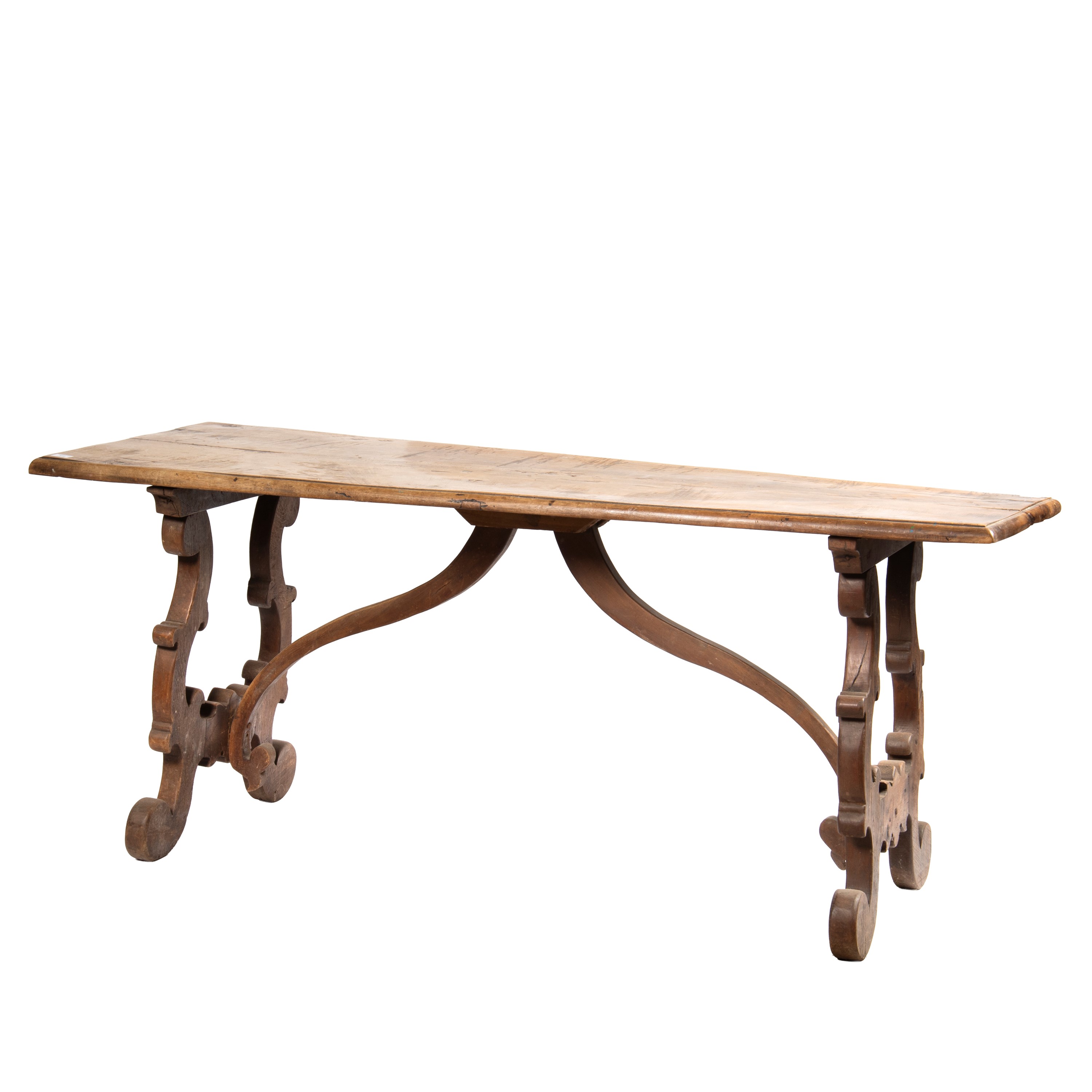 in noce, gambe a lira riunite da traversa, cm L185xP72xH79