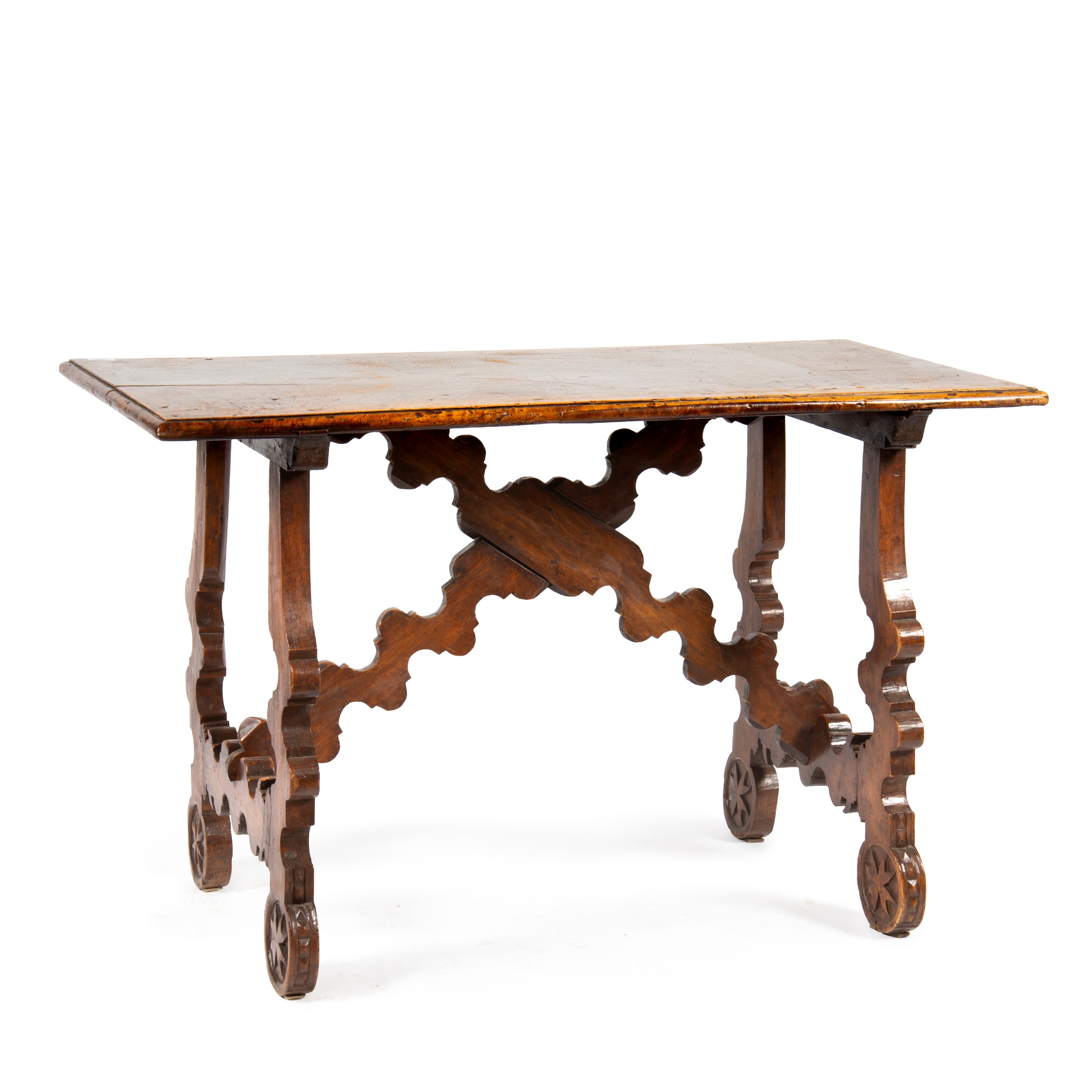 in noce, con gambe a lira e traversa sagomata, cm L126xP67xH80