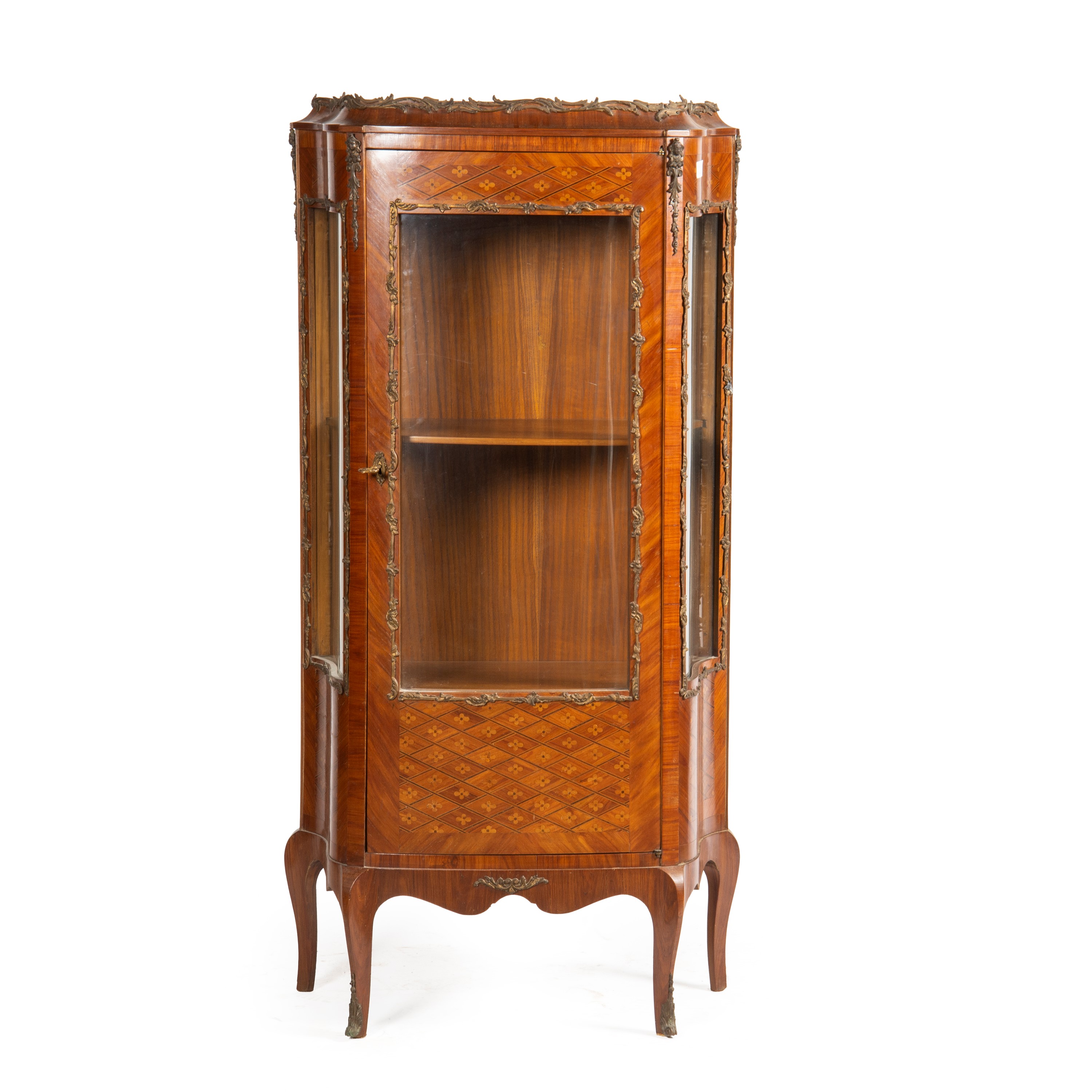 in noce intarsiato e sagomato, ad uno sportello, rapporti in metallo dorato, cm L69xP34xH141