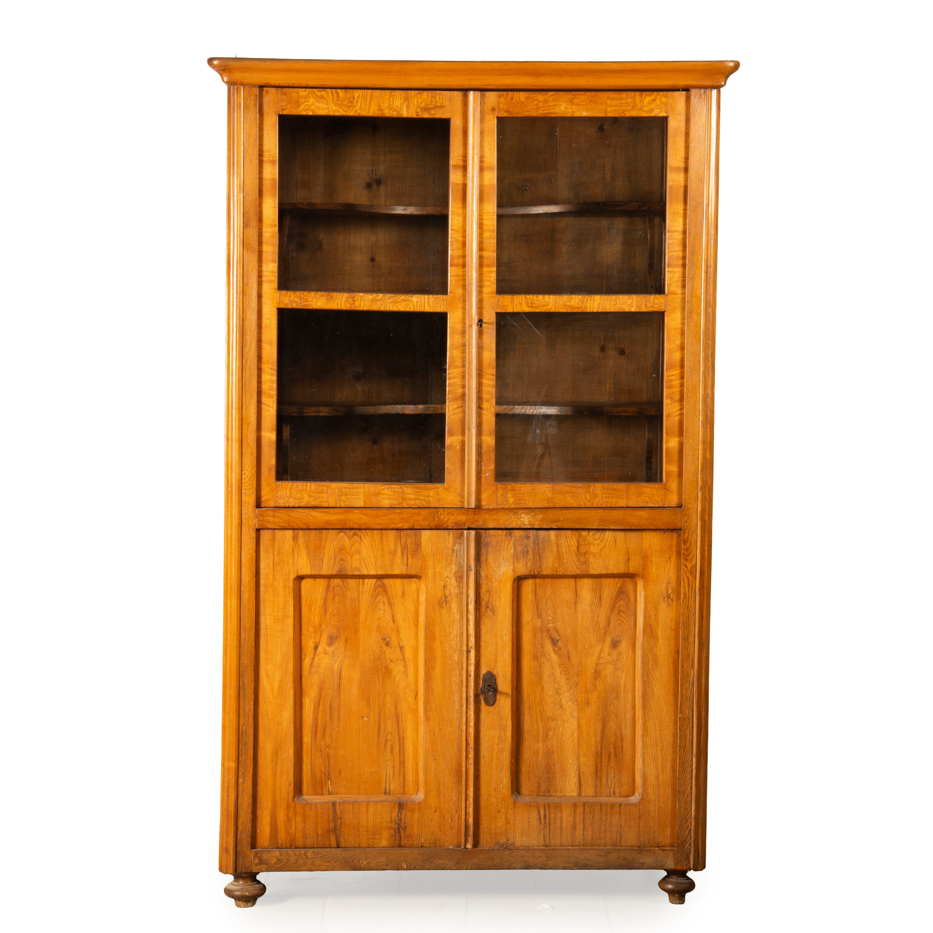 in rovere e castagno, a quattro ante due delle quali in vetro, piedi a cipolla, cm L111xP53xH179